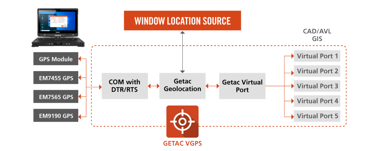 VGPS (Virtual Global Positioning System) ของ Getac สามารถ รับข้อมูล GPS จากโมดูล GPS จริง และ จำลองส่งออกไปยังพอร์ต COM หลายพอร์ตได้พร้อมกัน นอกจากนี้ VGPS ยังรองรับการส่งออก ข้อมูลตำแหน่ง GPS ไปยังระบบ Windows รวมถึงสัญญาณ DTR/RTS เพื่อสนับสนุนการทำงานของ ซอฟต์แวร์รุ่นเก่า (Legacy Applications) ได้อย่างครอบคลุมและมีประสิทธิภาพ.